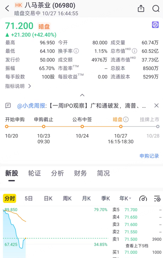 10月27日周一,八马茶业 在老虎暗盘交易之初暴涨80%,截至发稿,涨幅超42%。将于10月28日在香港联交所正式挂牌交易。公司被称为“茶叶第一股”,按2024年高端茶叶销售收入计,公司位居全国第一。
