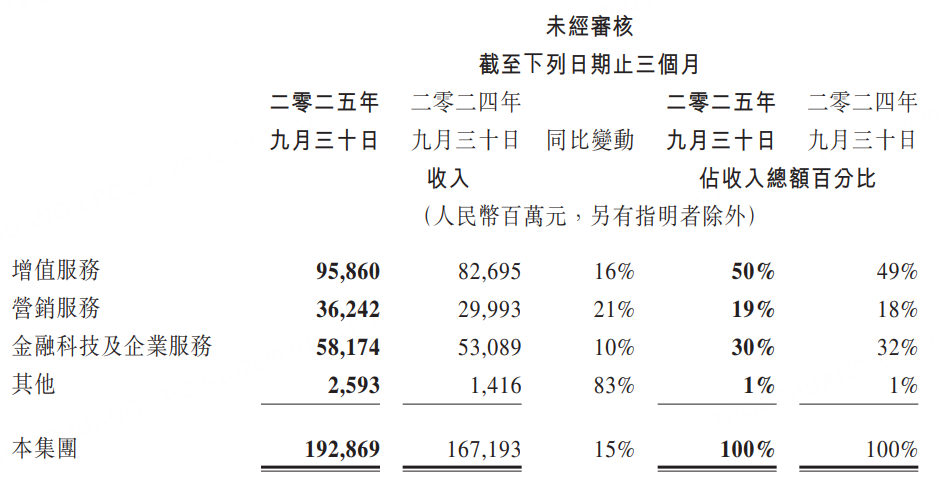 金融科技及企业服务收入581.74亿元,同比增长10%,占总收入30%。其中金融科技服务实现高个位数增长,商业支付活动及消费贷款服务贡献突出;企业服务收入增长十余个百分点,受益于云服务及AI相关服务需求上升,以及微信小店交易额扩大带动的商家技术服务费增长。