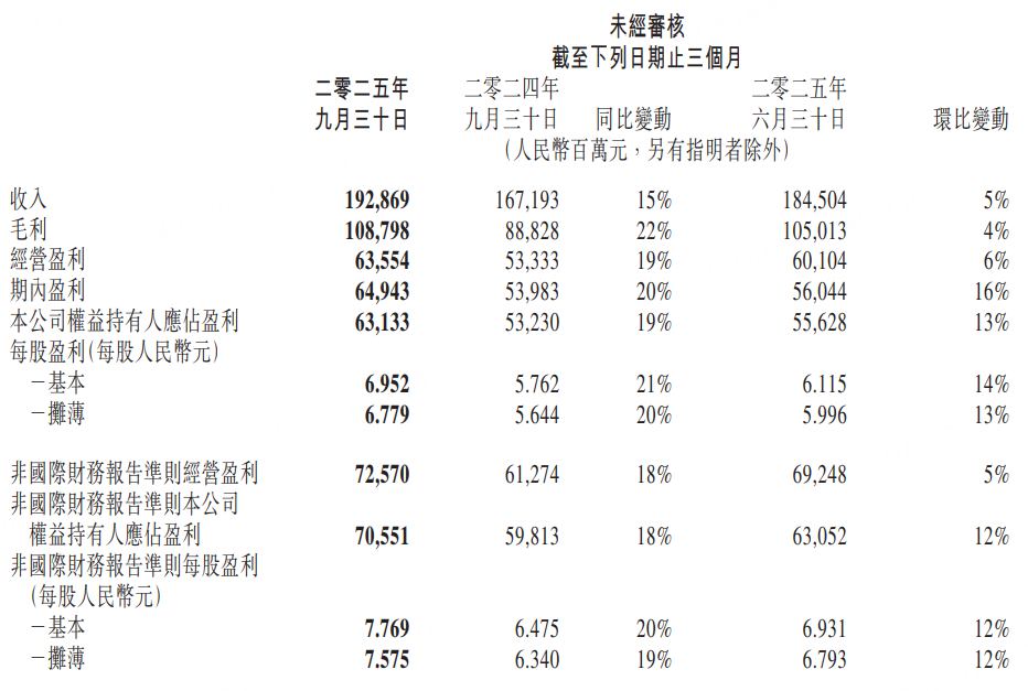 财务层面,腾讯第三季度实现营收1928.69亿元,同比增长15%;净利润631.33亿元,同比增长19%;非国际财务报告准则下净利润705.51亿元,同比增长18%,远超市场预期的660-680亿元。盈利能力显著提升,毛利率由去年同期的53%升至56%,毛利达1087.98亿元,同比增长22%。截至9月末,公司现金净额达1024.22亿元,较6月末增长37.3%,自由现金流585亿元,经营活动现金流净额853亿元,资金流动性充裕,为后续业务投入与股份回购提供有力支撑——本季度腾讯以总代价约211亿港元回购3536万股股份并注销,彰显对自身发展的信心。