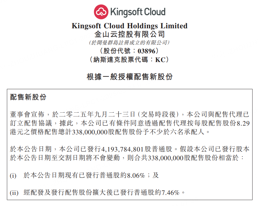 9月24日,金山云:根据一般授权配售新股份。于九月二十三日(交易时段后),公司与配售代理已订立配售协议,据此,公司已有条件同意透过配售代理按每股配售股份8.29港元(折价8.8%)的价格配售总计338,000,000股配售股份予不少于六名承配人。
