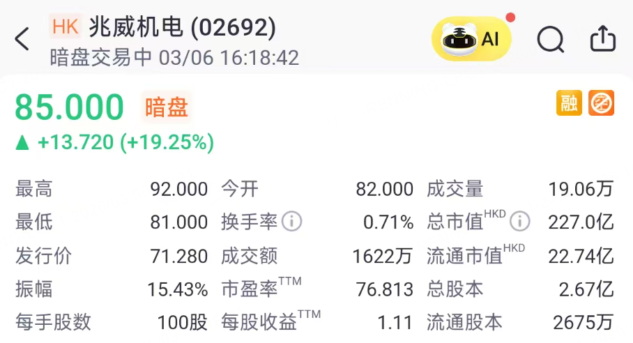 3月6日周五, 兆威机电 开启暗盘,盘初大涨超19%,不计手续费,每手赚超1300港元。根据弗若斯特沙利文报告,按2024年收入计,兆威机电是中国最大的一体化微型传动与驱动系统产品提供商,是全球第四大一体化微型传动与驱动系统产品提供商,市场份额分别为3.9%及1.4%。