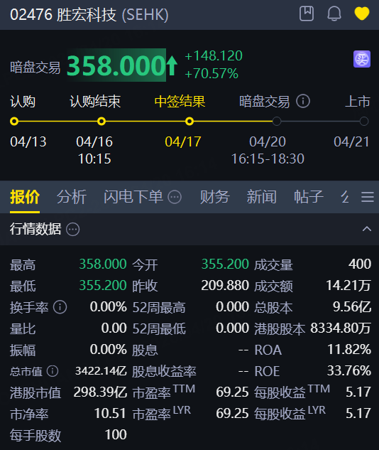 4月20日,胜宏科技暗盘飙升逾70%,总市值超3422亿港元,每股定价209.88港元,每手100股;将于4月21日(周二)正式在港交所挂牌交易。