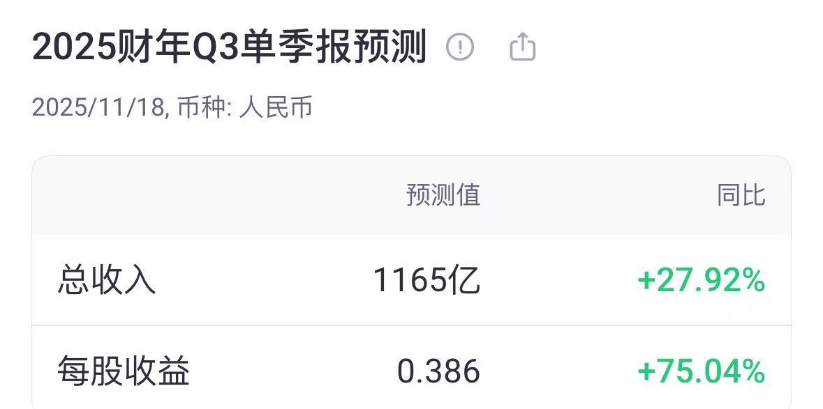 小米集团-W将于11月18日(港股盘后)发布其2025年第三季度财报。根据老虎国际APP数据预测,小米第三季度总收入约为1165亿元人民币,同比增长约28%。每股收益预计为0.39元,同比增长75%。