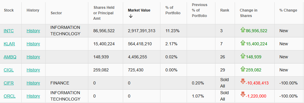 除了英特尔,软银在三季度还建仓了Klarna Group、芯片设计公司Ambiq Micro(AMBQ.US)及综合安全服务提供商Concorde International Group(CIGL.US)。软银在三季度清仓了加密矿企Cipher Mining(CIFR.US)以及甲骨文(ORCL.US)。