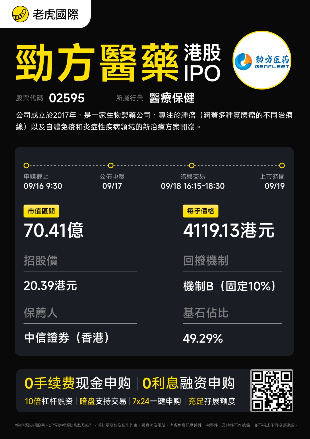 劲方医药-B发布公告,公司拟全球发售7760万股H股(视乎发售量调整权及超额配股权行使与否而定),中国香港发售股份776万股,国际发售股份6984万股;2025年9月11日至9月16日招股;发售价将为每股发售股份20.39港元,每手买卖单位为200股,中信证券为独家保荐人;预期股份将于2025年9月19日开始在联交所买卖。