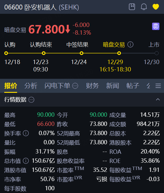 “AI具身家庭机器人系统提供商”卧安机器人暗盘跌超8%,总市值超150亿港元;公司每股定价73.8港元,每手100股,将于12月30日(周二)正式挂牌交易。