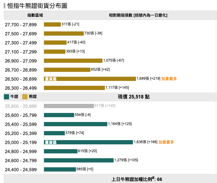恒指近日在26000點水平上落,上日好淡倉資金流或反映輪場投資者傾向進場博反彈,恒指牛 恒指摩通八十牛N.C /熊 恒指摩通八八熊X.P 。