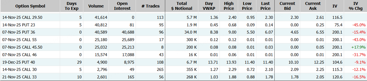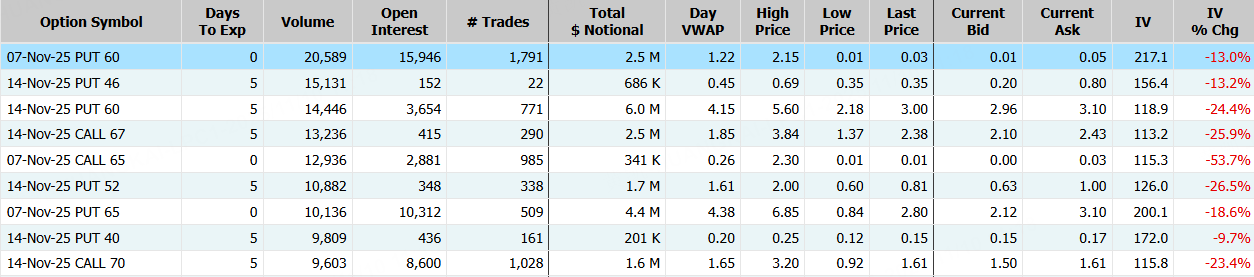 上周五,IREN Ltd跌近7%,期权合约成交48.32万张,较90日均量放大2.1倍。11月07日到期的60美元的行权看跌期权交易量特别高,共有20,589份合约交易。