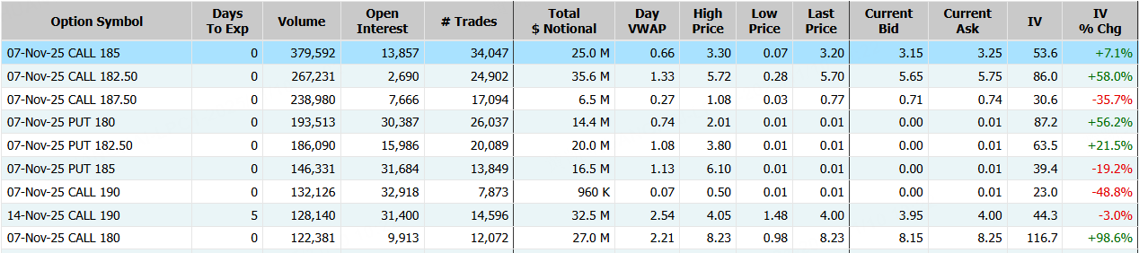 上周五,英伟达顽强收涨,盘中一度跌超4%。期权合约成交520.37万张,较90日均量放大1.9倍。11月7日到期的185美元的行权看涨期权交易量特别高,共有379,592份合约交易。