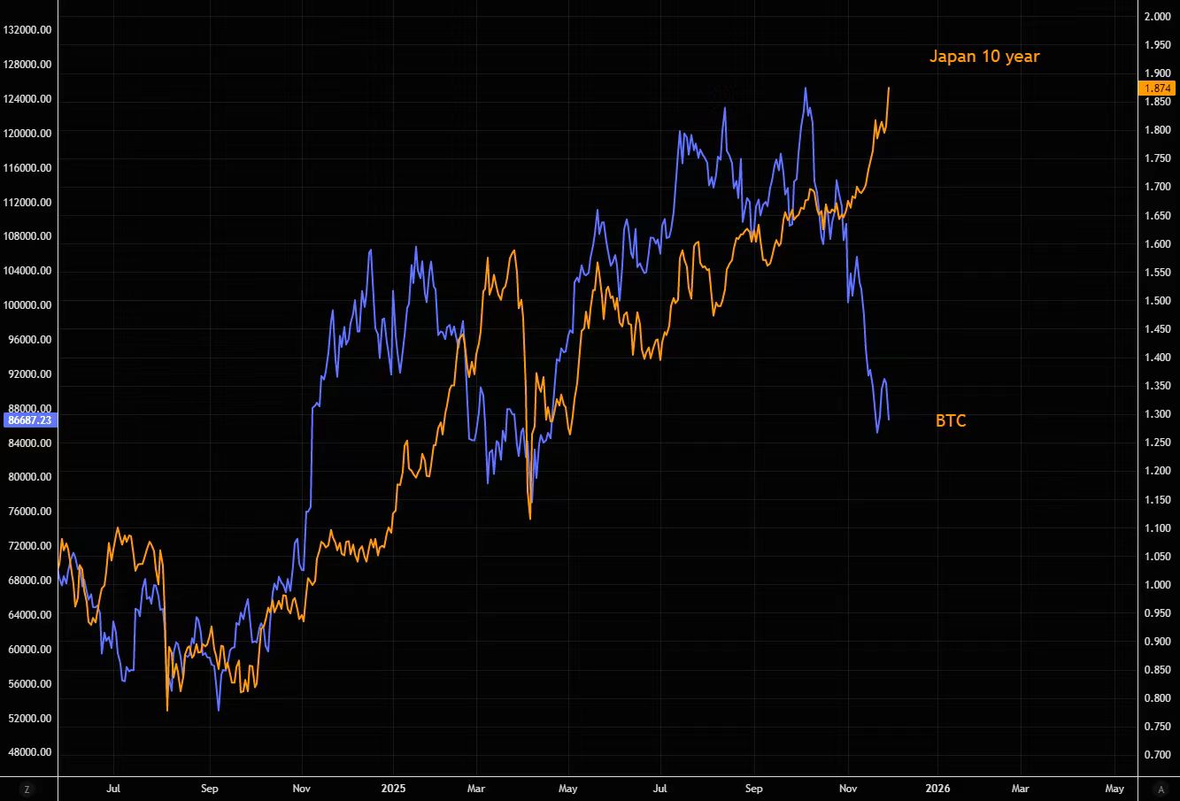而比特币这一轮抛售恰逢日本10年期国债开始飙升。