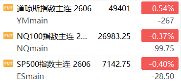 4月23日,美股三大股指期货下跌,截止发稿,道指期货跌0.54%,纳指期货跌0.37%,标普500指数期货跌0.40%。