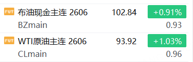 WTI原油期货上涨0.91%,报102.84美元/桶;布伦特原油期货上涨1.03%,报93.92美元/桶;