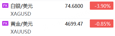 现货黄金下跌0.85%,报4699.47美元/盎司;现货白银下跌3.90%,报74.68美元/盎司。