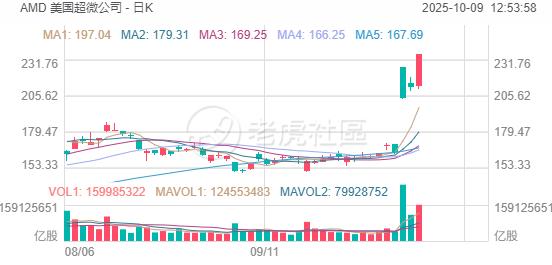 AMD隔夜大幅收涨逾11%,股价突破230美元创历史新高,该股近三个交易日累计大涨43%。这波涨势主要源于,本周一OpenAI宣布与AMD达成合作,将部署合计算力6千兆瓦(GW)的AMD芯片。当天,AMD股价一度涨近38%,收涨近24%,为一年来最佳单日表现。