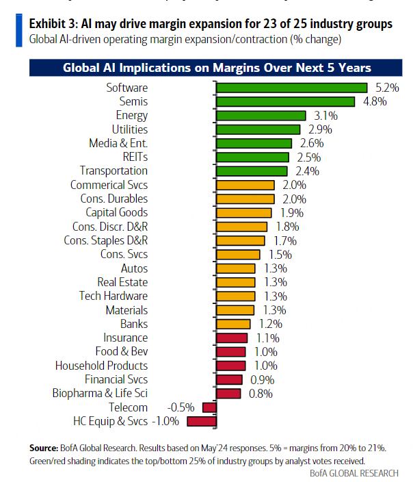 AI在企业中的部署正从试点迈向生产阶段,这有望在未来 5 年将标普500公司的运营利润率提高 200 个基点,相当于每年节省约 550 亿美元的成本。我们的分析师预计,人工智能将推动全球 25 个行业组中的 23 个实现利润率扩张,实施人工智能可能使半导体和软件行业的利润率分别提高约5%。
