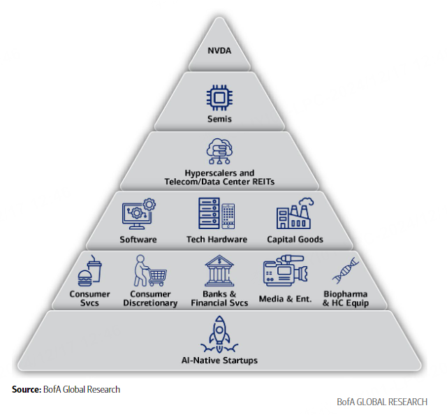 美银提到,人工智能的上行空间远远超出英伟达以及更广泛的基础设施层,英伟达只是整个AI革命的冰山一角。