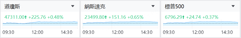 截至收盘,标普500指数涨0.37%,报6796.29点;纳斯达克综合指数涨0.65%,报23499.8点;道琼斯工业平均指数涨0.48%,报47311点。