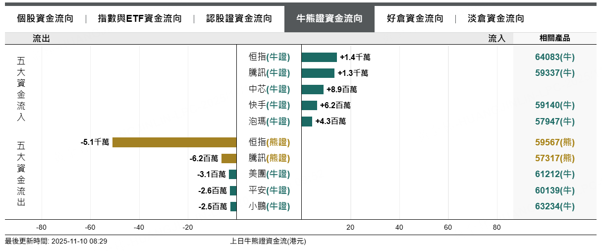 恒指熊證上個交易日淨流出5100萬元,騰訊熊證淨流出620萬元。