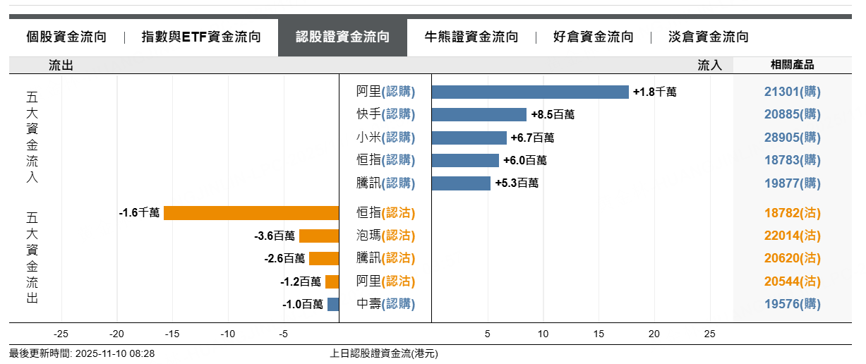 恆指牛證上個交易日净流入1400玩元,騰訊牛正净流入1300萬元,中芯國際净流入890萬元。