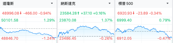 东时间周三,美股三大指数涨跌不一。截至收盘,道指跌466.00点,跌幅为0.94%,报48996.08点;纳指涨37.10点,涨幅为0.16%,报23584.27点;标普500指数跌23.89点,跌幅为0.34%,报6920.93点。