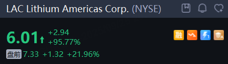 Lithium Americas Corp.续涨约22%,昨日飙升超95%。此前有消息称美国政府正与该公司谈判,拟通过入股方式重组一笔23亿美元的能源部贷款,此举有望使矿商和项目开发商从中受益。