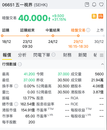 12月29日,“Physical AI第一股” 五一视界 暗盘涨超31%,总市值超162亿港元。公司每股定价30.5港元,每手200股,不计手续费,目前每手赚超1900港元。预计将于12月30日(周二)正式挂牌交易。