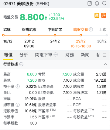 预制钢结构建筑分包服务提供商 美联股份 涨超23%,总市值超10亿港元。公司每股定价7.1港元,每手300股,不计手续费,目前每手赚超510港元。预计将于12月30日(周二)正式挂牌交易。