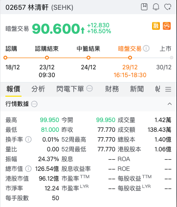 “中国高端国货护肤品牌” 林清轩 暗盘涨超16%,总市值超126亿港元。公司每股定价77.77港元,每手50股,不计手续费,目前每手赚超641.5港元。预计将于12月30日(周二)正式挂牌交易。