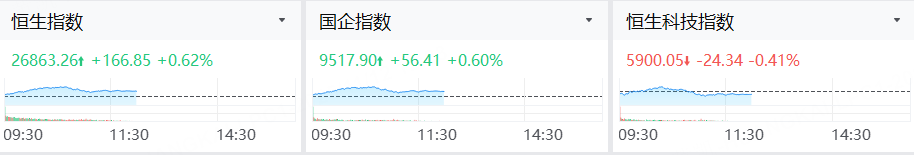 11月12日,港股三大指数涨跌不一,截止午间收盘,恒生指数涨0.63%,恒生科技指数跌0.41%, 国企指数涨0.60%。