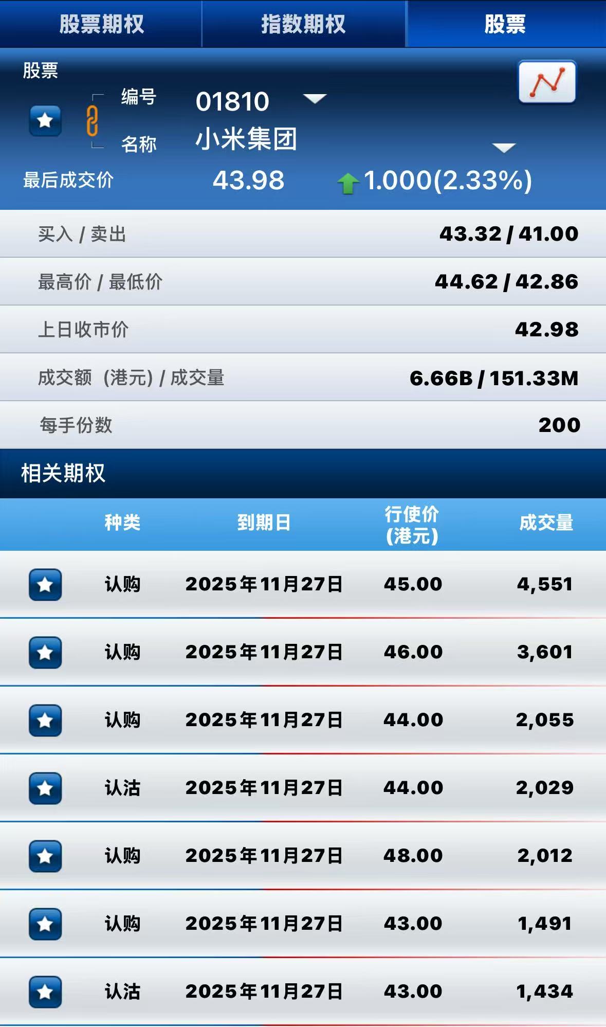 双十一全渠道累计支付金额破290亿元,小米集团-W涨超2%!期权方面:半日成交超5.7万张合约,其中于2025年11月27日到期行权价45港元的认购期权成交量居前,成交超4500张合约。 $MIU.HK 20251127 45.00 CALL$