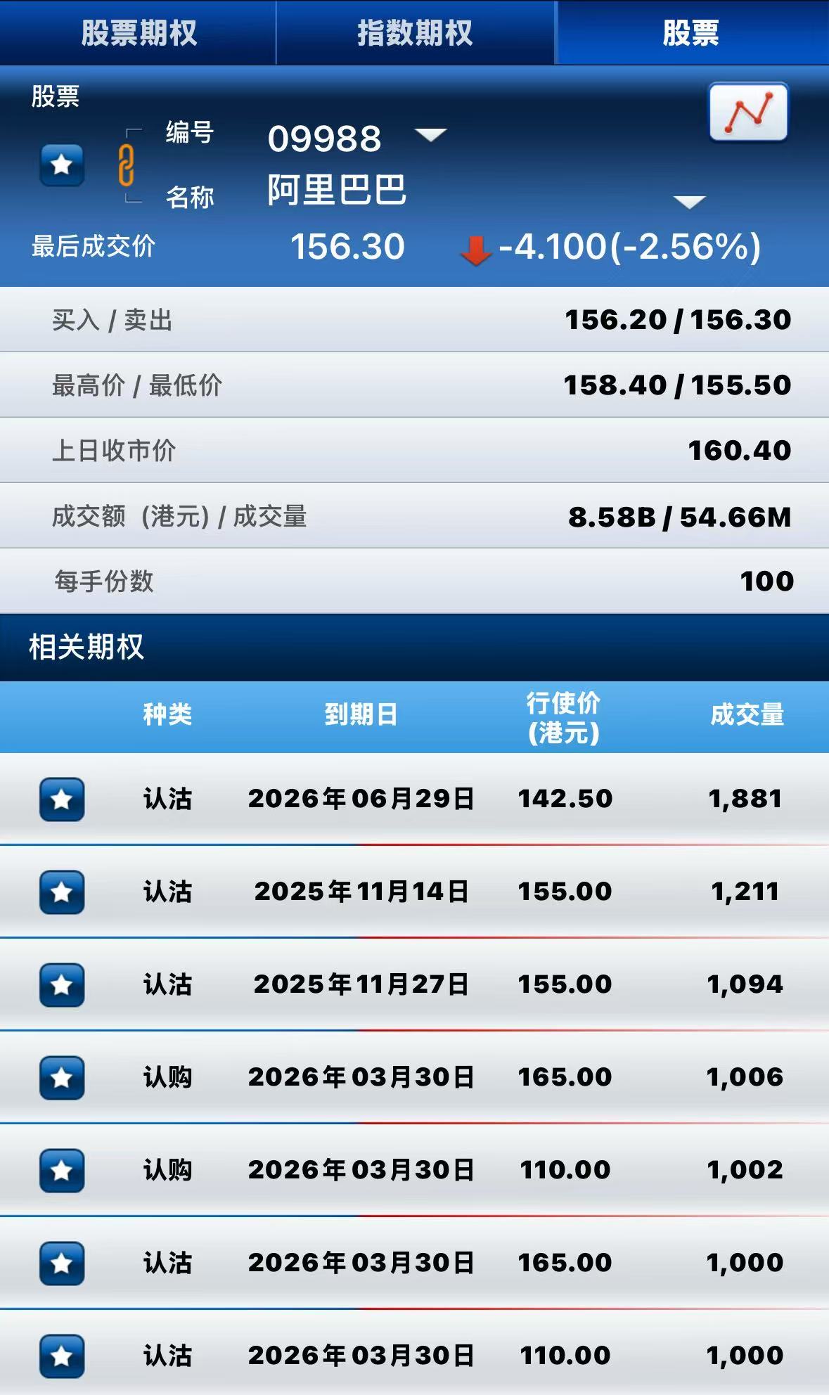阿里巴巴-W跌超2%,期权方面:半日成交超3.4万张合约,其中于2026年6月29日到期行权价142.5港元的认沽期权成交量居前,成交近1900张合约。 $ALB.HK 20260629 142.50 PUT$