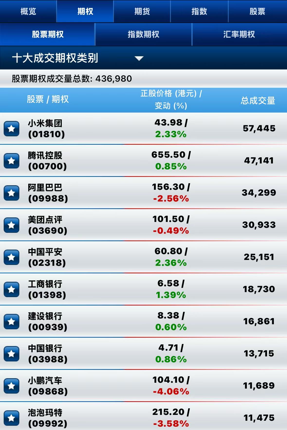 截止午间收盘,港股期权半日成交近43.7万张。其中,小米集团-W成交量居前,期权成交超5.7万张;腾讯控股名列次席,期权成交超4.7万张;阿里巴巴-W位居第三,期权成交超3.4万张。