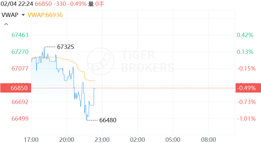 Tiger Trade行情显示,BTC跌至66850美元,盘中一度跌破6.6万美元关口,24H跌幅0.49%;ETH升至2052美元,日内跌幅0.33%。
