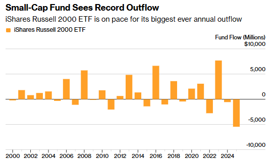 美国股市中风险最大的板块在过去几周里表现强劲,过去四年里因小盘股而遭受过多次损失的投资者们将这些账面收益变现。从追踪罗素 2000 指数的最大交易所交易基金(ETF)的资金流动情况来看,投资者正在以极快的速度套取利润,而且他们的获利速度几乎与撤资速度同步。今年已有约 54 亿美元资金从 iShares 罗素 2000 ETF中撤出,而该指数也已攀升至历史新高。