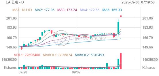 EA股价周一上涨4.5%。此前周五,因外电报道称该公司即将达成私有化交易,股价大涨约15%,收于193.35美元。