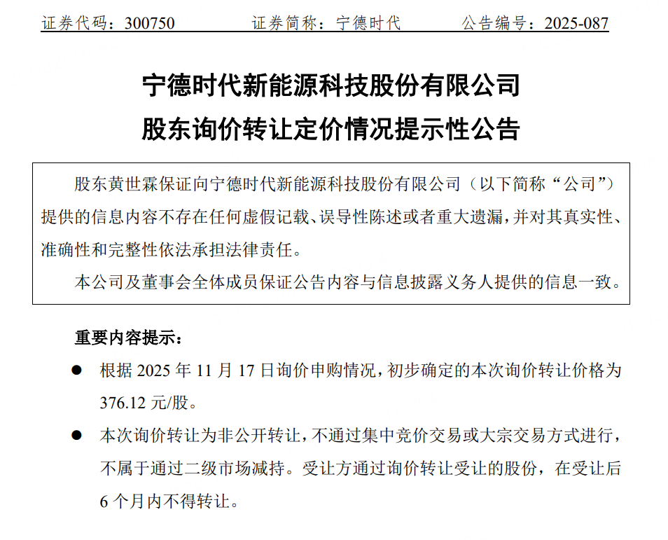 11月17日,宁德时代公告称,根据2025年11月17日询价申购情况,初步确定的本次询价转让价格为376.12元/股。本次询价转让拟转让股份已获全额认购,初步确定受让方为16家机构投资者,拟受让股份总数为45,632,363股。