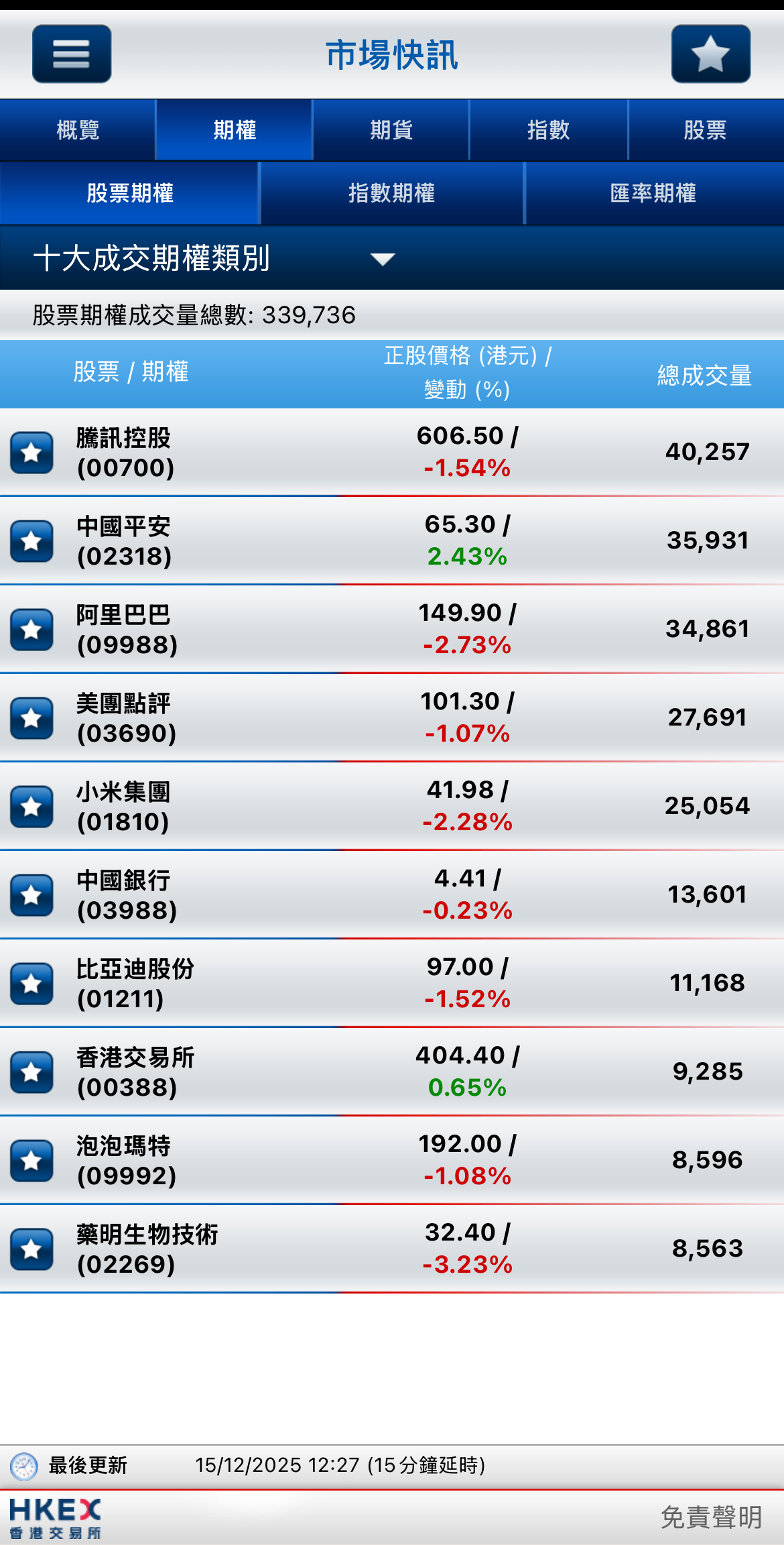 港股期权半日成交339736张合约。其中, 腾讯控股 成交量排名第一,达40257张合约。中国平安排第二,成交35931张合约。阿里巴巴排第三,成交34861张合约。