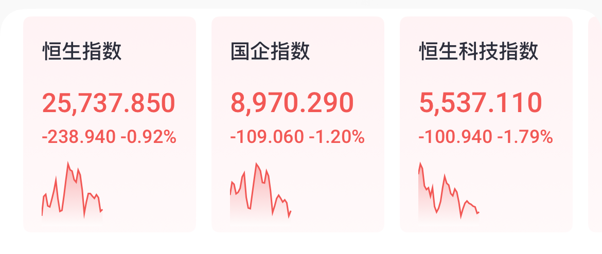 港股午间收盘,恒生指数跌0.92%,恒生科技指数跌1.79%。科技股普跌,百度集团跌逾4%,阿里巴巴跌近3%,腾讯控股、京东集团跌超1%。芯片股走低,华虹半导体跌逾6%,中芯国际跌近3%。