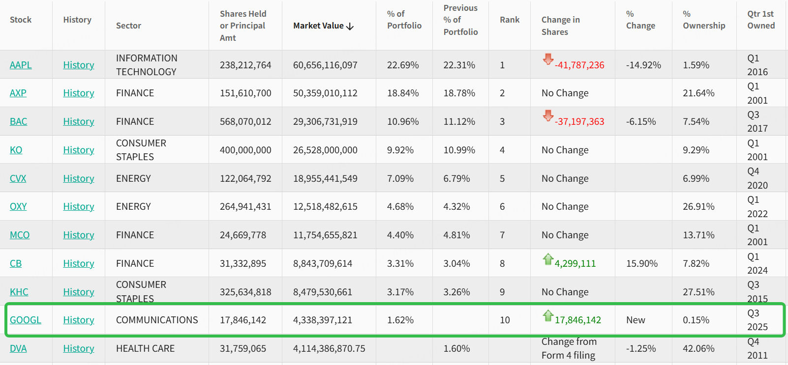 13F 文件顯示,伯克希爾於三季度新進 Alphabet(GOOGL)約 1,785 萬股,這是該公司首次建倉谷歌母公司。