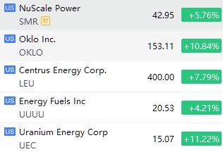 10月10日(周五),美股核电股集体走高,Uranium Energy涨超11%,Oklo涨超10%,Centrus Energy涨超7%,NuScale Power涨超5%,Energy Fuels涨超4%。
