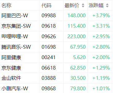 科指成分股中,阿里巴巴-W涨3.79%,京东集团-SW涨3.31%,哔哩哔哩-W涨2.95%,腾讯音乐-SW涨2.8%,百度集团-SW跌2.49%。