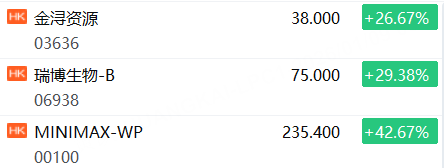 新股方面:MiniMax上市首日开涨超42%,瑞博生物-B涨超29%,金浔资源涨超26%。