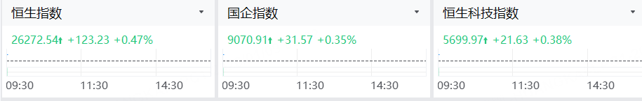 1月9日,港股三大指数高开,恒指涨0.47%,国指涨0.35%,恒生科技指数涨0.38%。