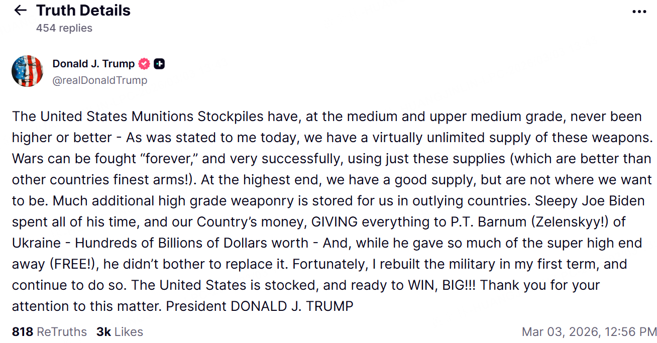 美國總統特朗普3月3日在Truth Social發文強調,美軍在中等到中上級彈藥儲備方面,從未像現在這樣充足且品質優異——據當日匯報,我們擁有近乎無限供應的此類武器。僅憑這些儲備(品質優於其他國家頂級武器),即可「永遠」作戰,並取得極為漂亮的勝利。在最高端武器方面,我們儲備良好,但尚未達理想水平。大量額外高端武器存放在海外盟國供美方使用。