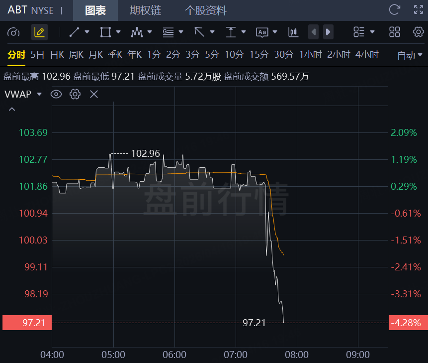 4月16日,雅培盘前跌超4%!下调了年度利润预期,此前该公司调整了去年以 210 亿美元收购一家癌症筛查公司的交易的影响,该交易旨在提振其疲软的诊断业务。