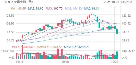 10月23日,港股生物技术股盘中走弱,荣昌生物跌近12%,药捷安康-B跌超8%,科伦博泰生物-B跌超6%,晶泰控股、映恩生物-B跌近6%,药明生物、康方生物、百济神州跟跌。