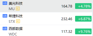 9月29日(周一),数据硬盘制造商多数上涨,西部数据涨超9%, 希捷科技涨近7%,股价双双创历史新高,美光科技涨超4%
