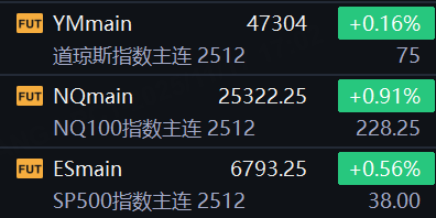 11月17日,美股三大股指期货齐涨,截止发稿,道指期货涨0.16%,纳指期货涨0.91%,标普500指数期货涨0.56%。