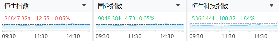 今日港股低开高走、尾盘企稳。三大指数分化:恒生指数收报26847.32点,涨0.05%;恒生科技指数收报5366.44点,跌1.84%;国企指数收报9048.38点,跌0.05%。