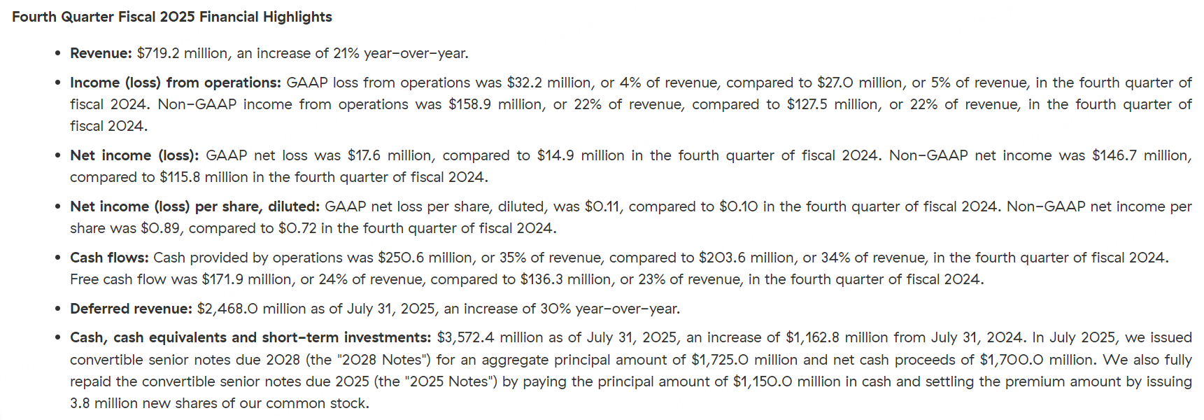 9月3日,网络安全公司Zscaler公布了2025财年第四季度财报,公司本季度营收达到 7.192 亿美元,较上年同期增长 21%。按 非 GAAP 标准,公司本季度 摊薄后每股收益为 0.89 美元,高于去年同期的 0.72 美元。